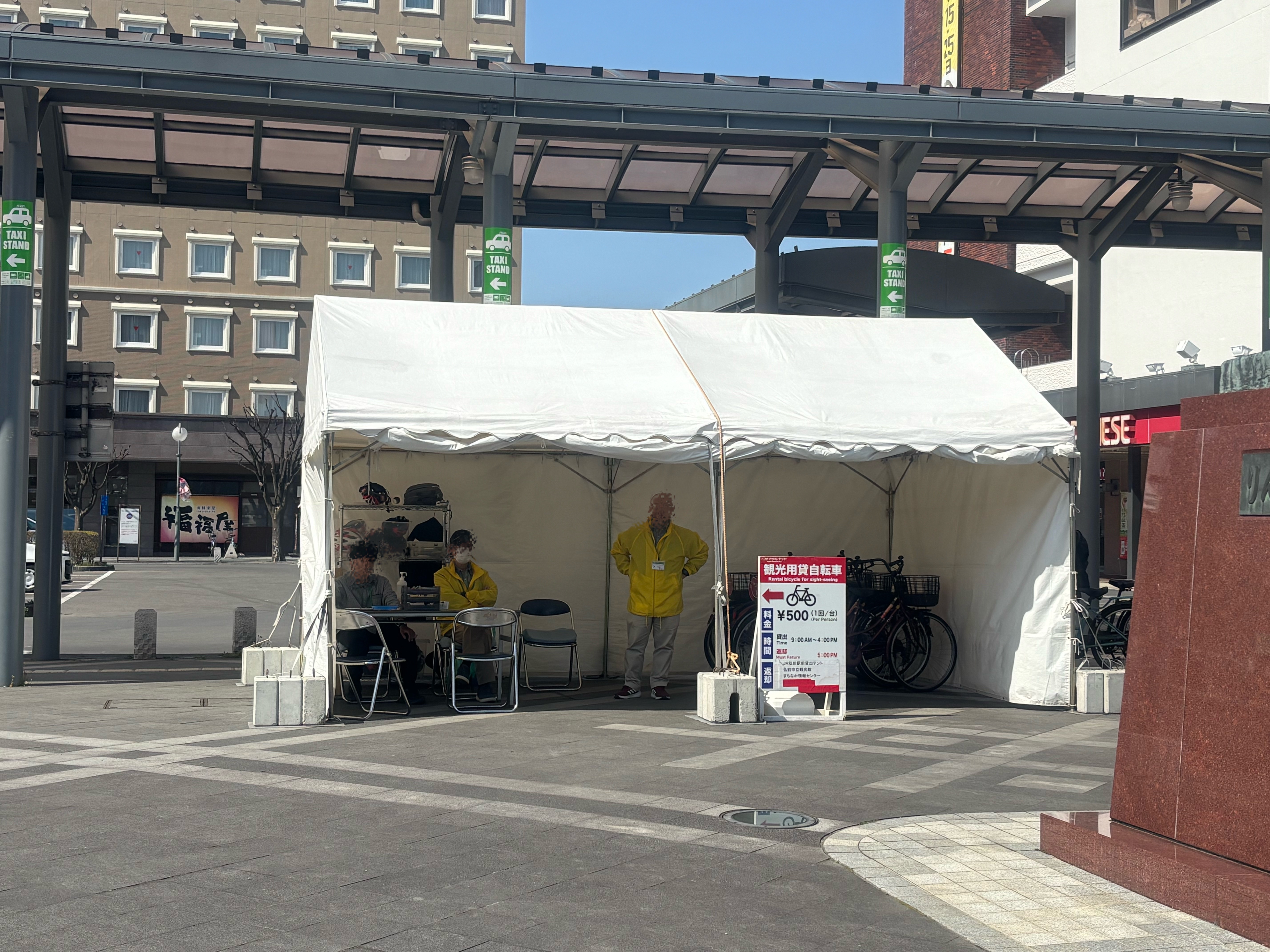 レンタサイクルは普段は5カ所のステーションで貸出しておりますが、さくらまつり期間中は3カ所のステーションで貸出しており、弘前市立観光館、JR弘前駅前特設テント、弘前市まちなか情報センターで借りることができます。