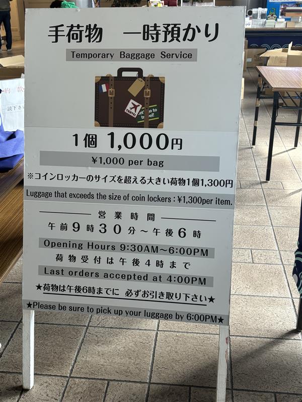 荷物(1個) | 1,000円(コインロッカーのサイズを超える大きさの荷物は1個1,300円) |