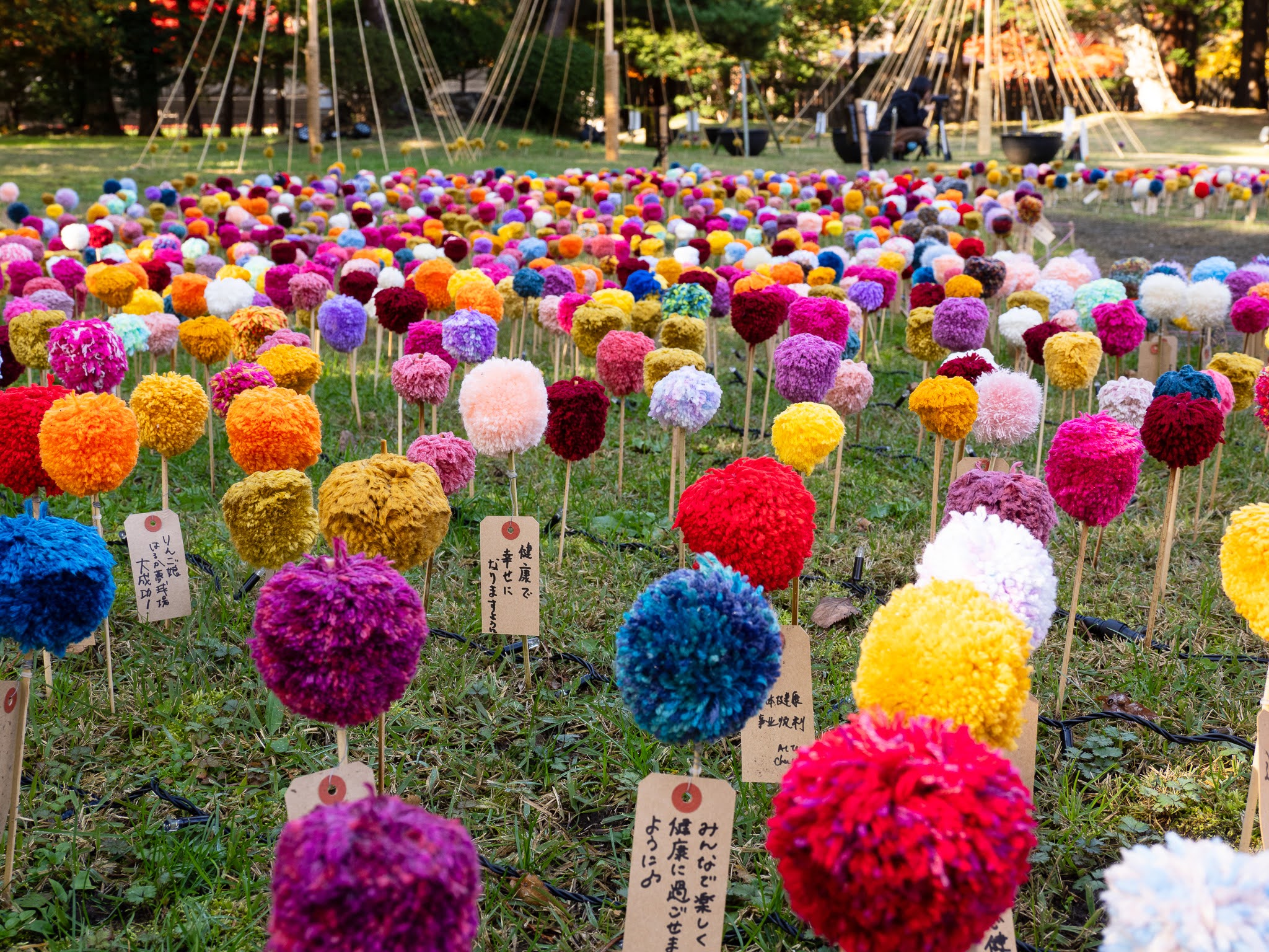 毛糸で作られた「ぽんぽんマム」に願いごとを書いた短冊を飾ったぽんぽんマムの庭。