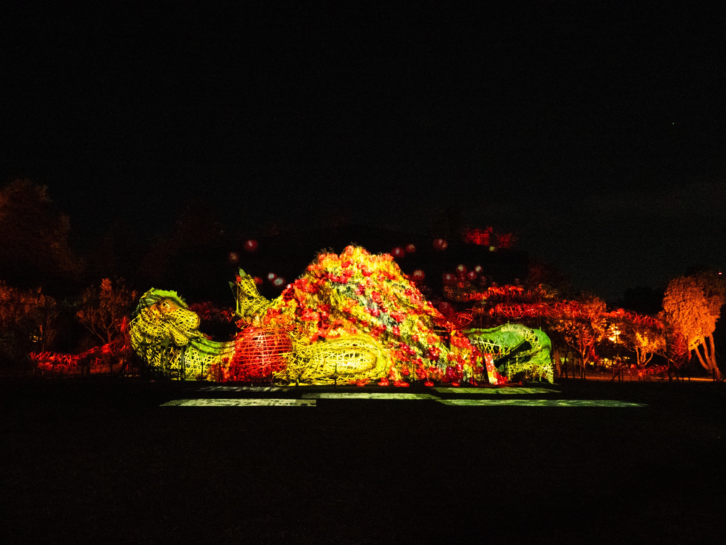 今年は熊本県を拠点に国内外で活躍する“竹あかり”総合プロデュース集団「CHIKAKEN(ちかけん)」によるオブジェが、東内門前と植物園北側入り口などに展示されていました。