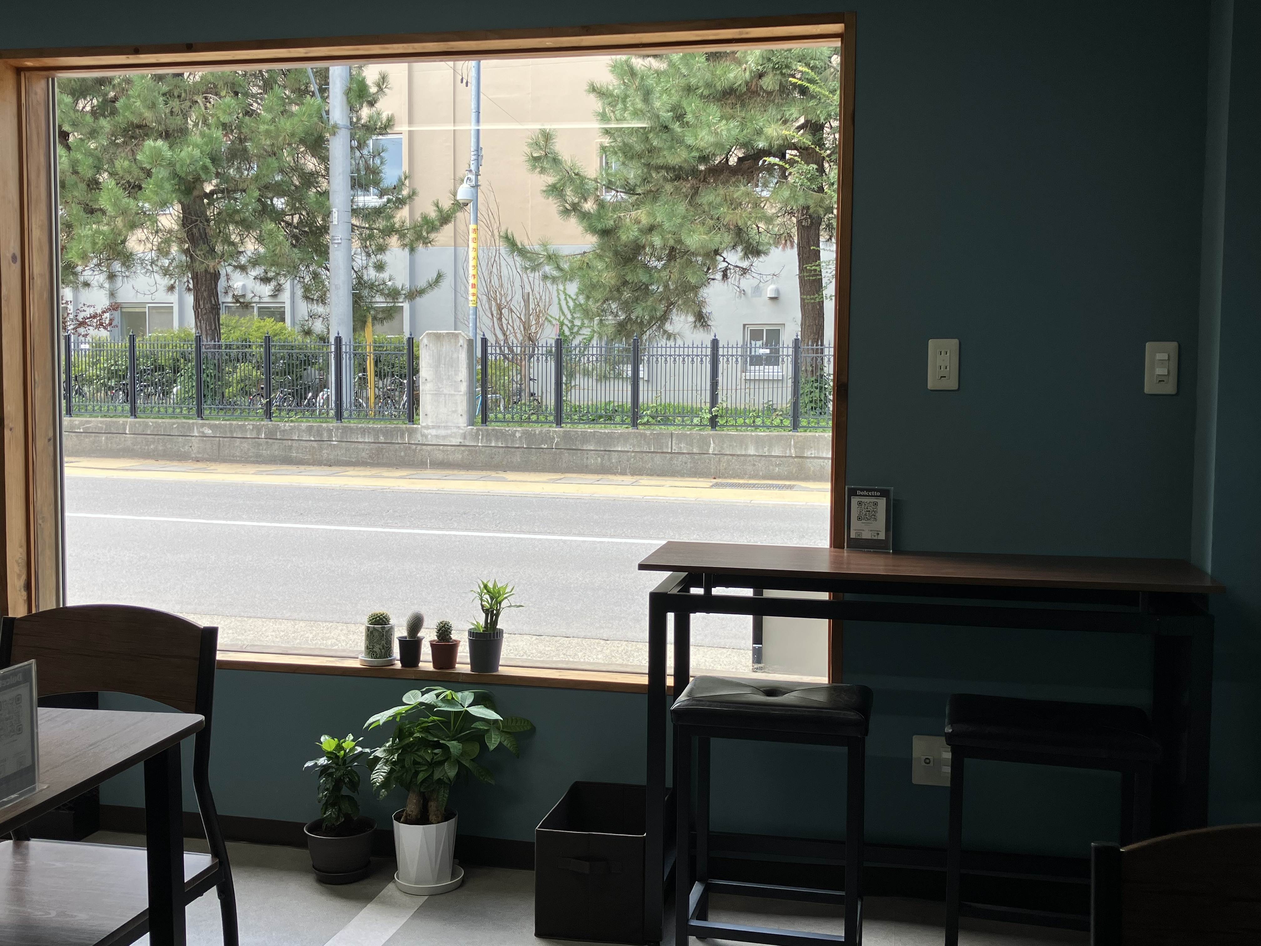 道路に面して『COFFEE』の文字があり、その下には目をひく、大きくて広い窓が広がっています。