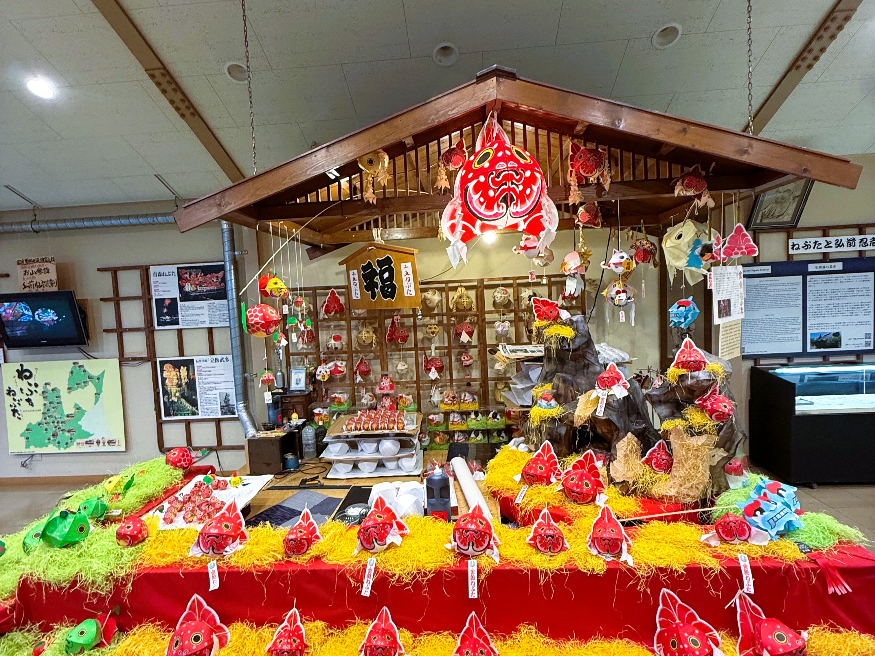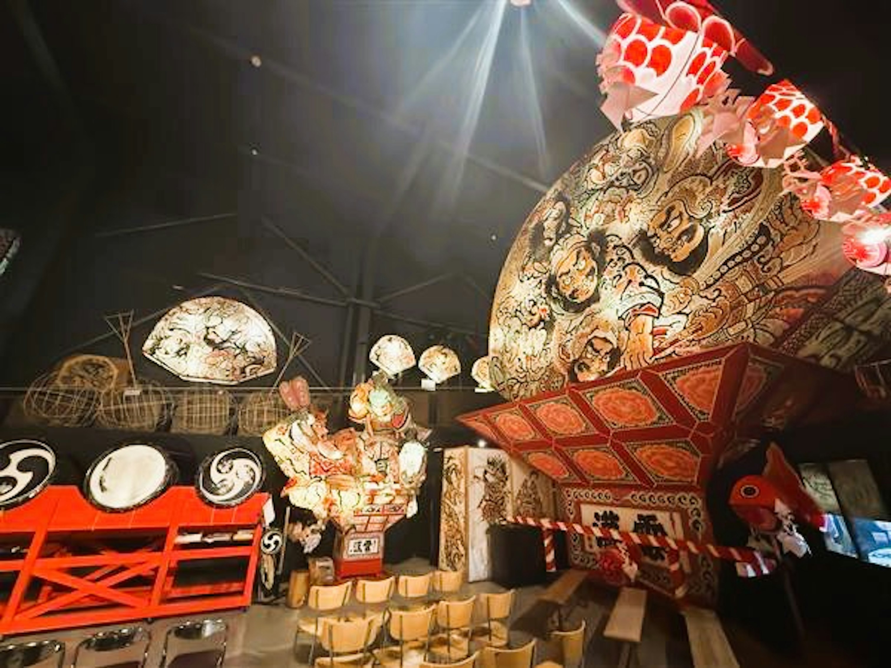 館内には実物大のねぷたが展示され、迫力ある絵と太鼓の音が祭りの熱気を伝えます。