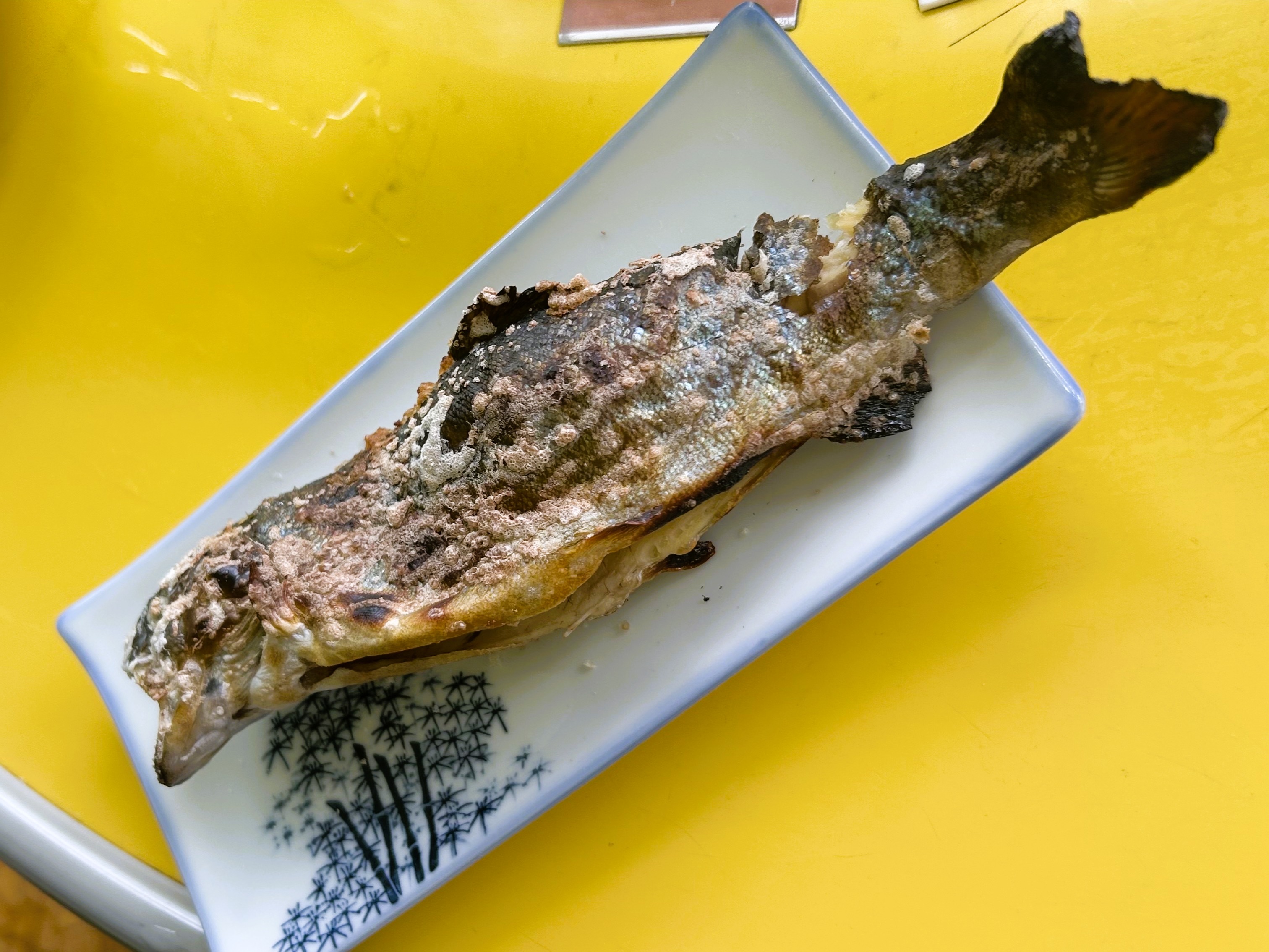 釣ったばかりのニジマスは熟練の技で調理され、香ばしい塩焼きやサクサクの唐揚げにして提供されます。
