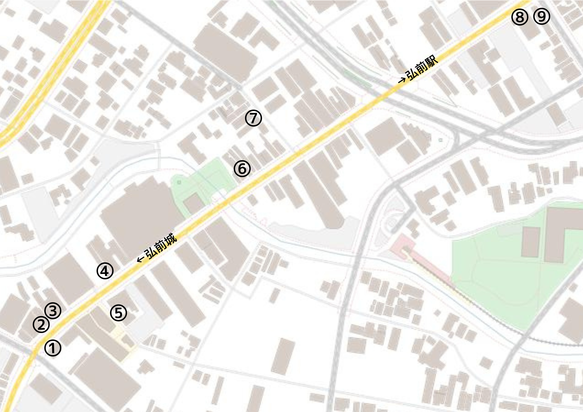 今回は弘前城側の下土手町から弘前駅側の上土手町に向かうコースでご紹介していきます。
