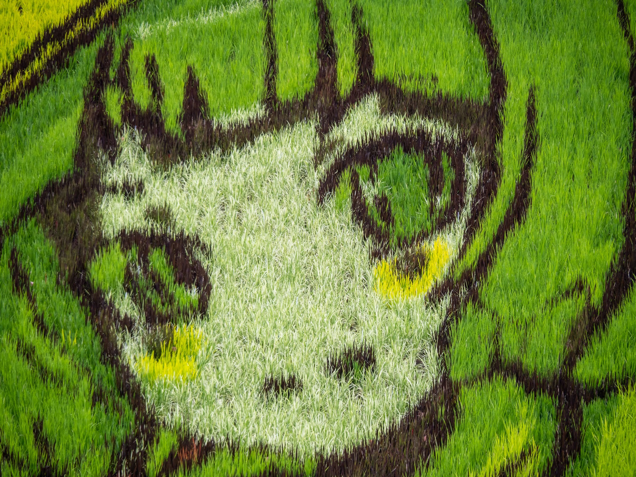 顔の部分を拡大してみると、確かに稲の植え分けで描かれていることがわかりますね。