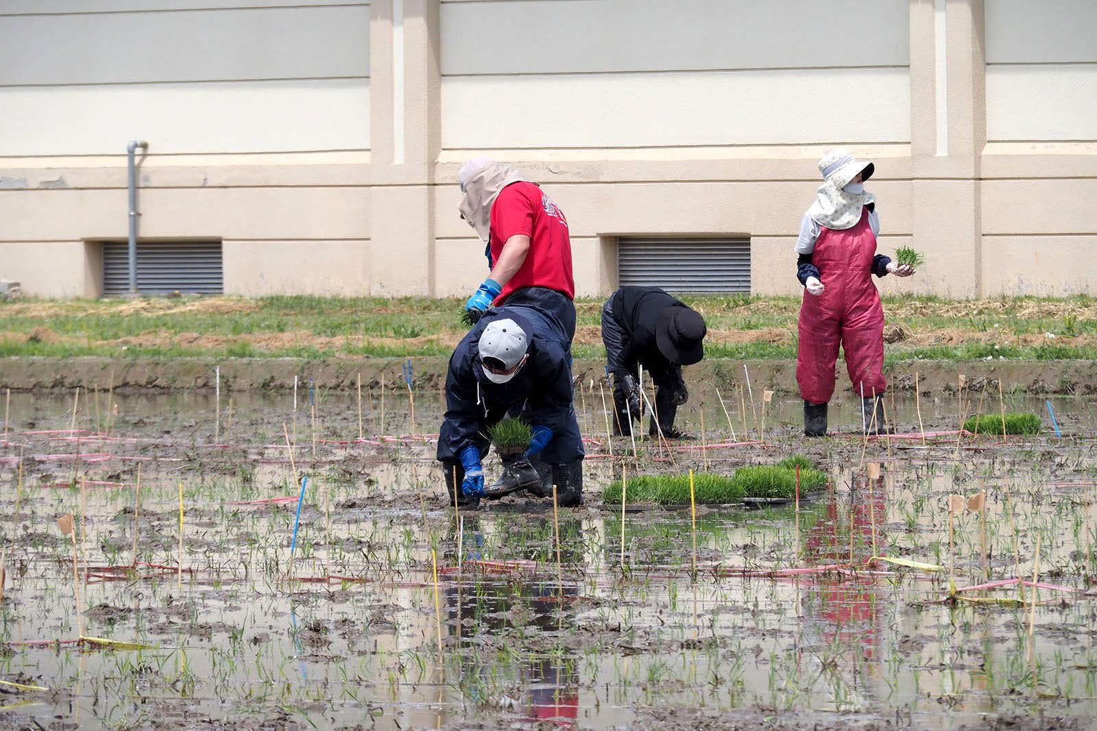 数千本の目印を立てた田んぼに一つ一つ植え分けをしたり。