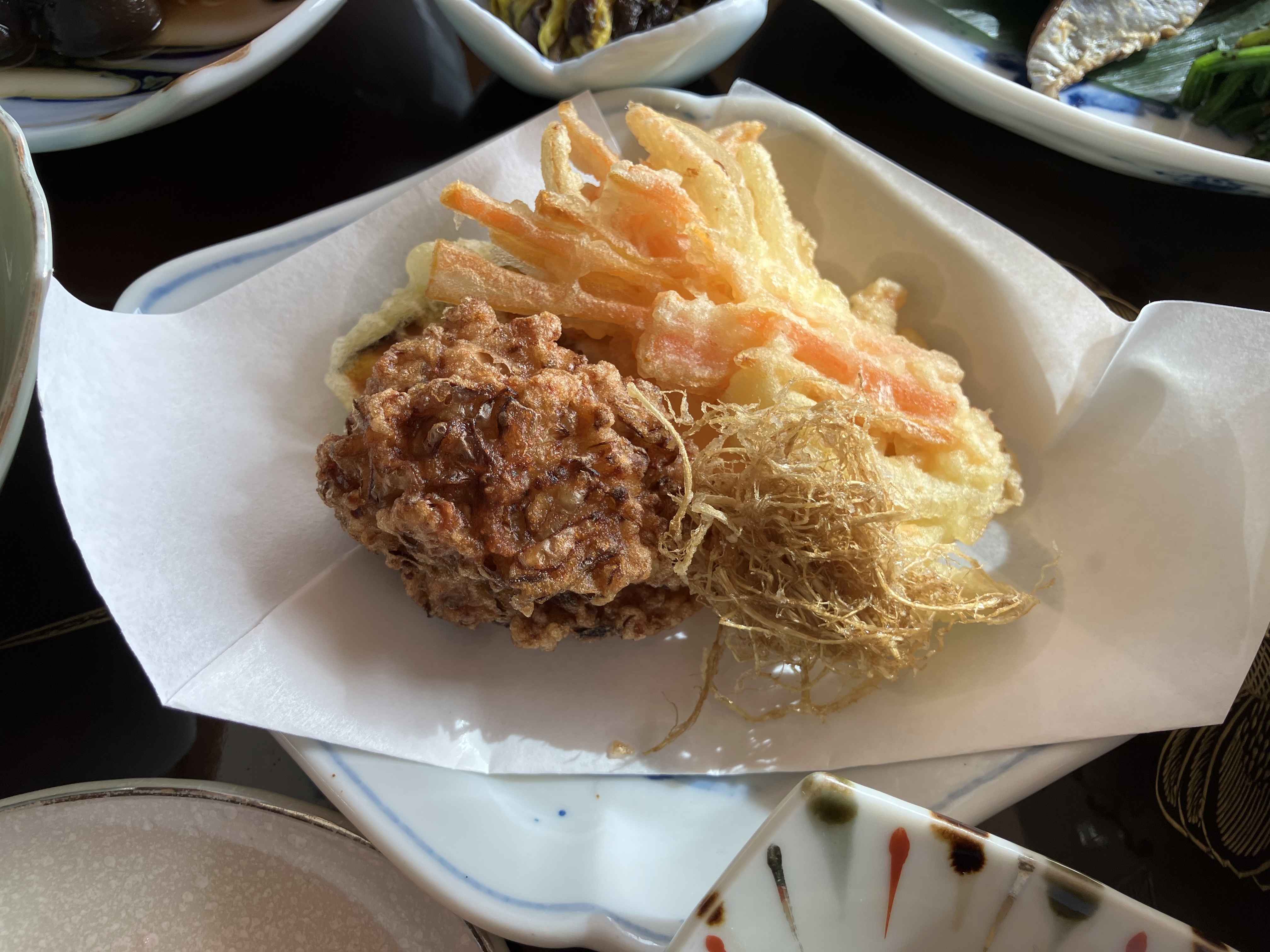 一緒に季節の野菜のかき揚げと、大鰐温泉もやしの根を素揚げにしたものが付きます。