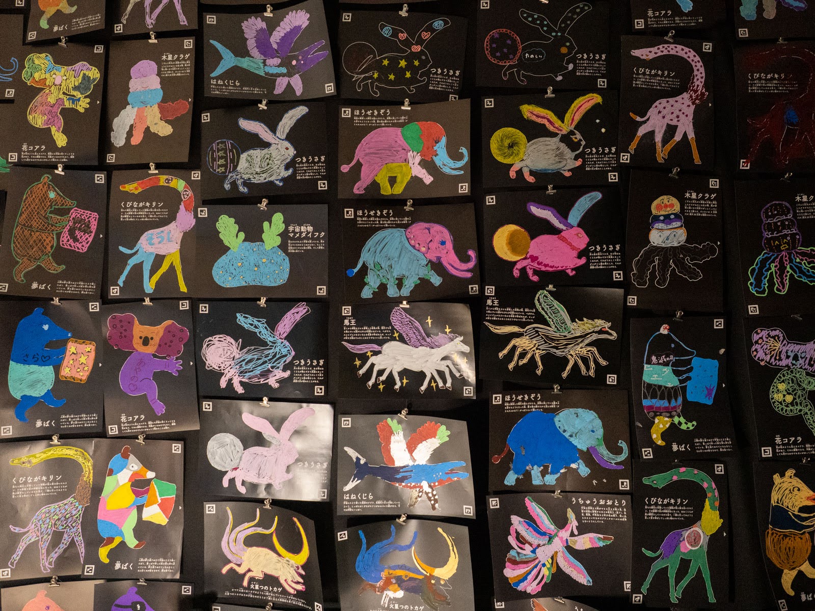 「つきうさぎ」「馬王」「うちゅうおおとり」「マメダイフク」などなど、ファンタジー感あふれる宇宙動物たちの線画に、好きな色・模様を塗ってスキャンすると、部屋の壁に投影されて動き出すのです。