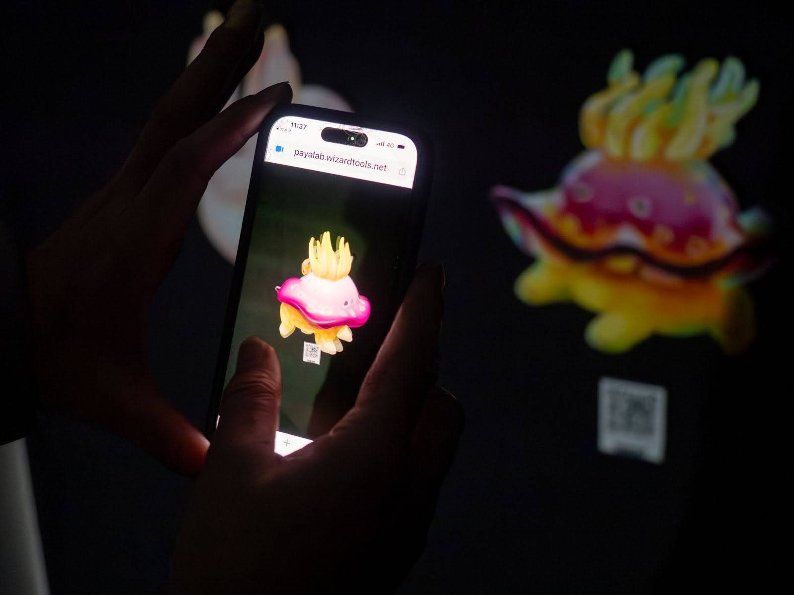 2階に上がって奥の「絵から飛び出す動物たちのAR」はスマートフォンでQRコードを読み込むと、この宇宙動物が画面上に現れるものでした。