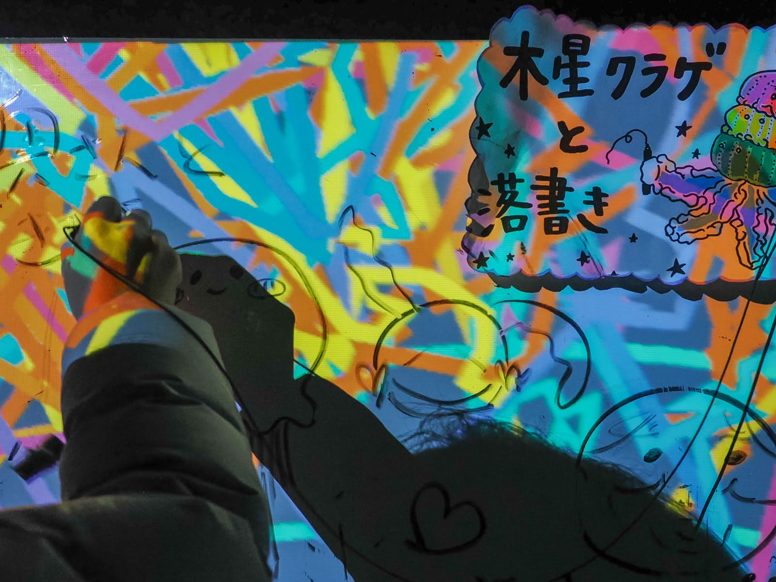 ホワイトボードの壁面にマーカーで落書きすると、光るクラゲがやってくる「木星クラゲと落書き」。